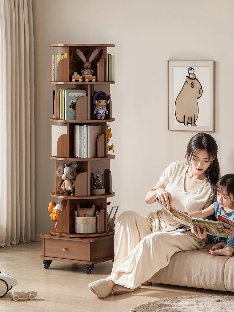 360度回転式の丸型フロア書棚 - スペースを取らない学生用ラック、リビングに最適な絵本スタンド!おしゃれで機能的、あなたの読書スペースをスタイリッシュに演出します。
