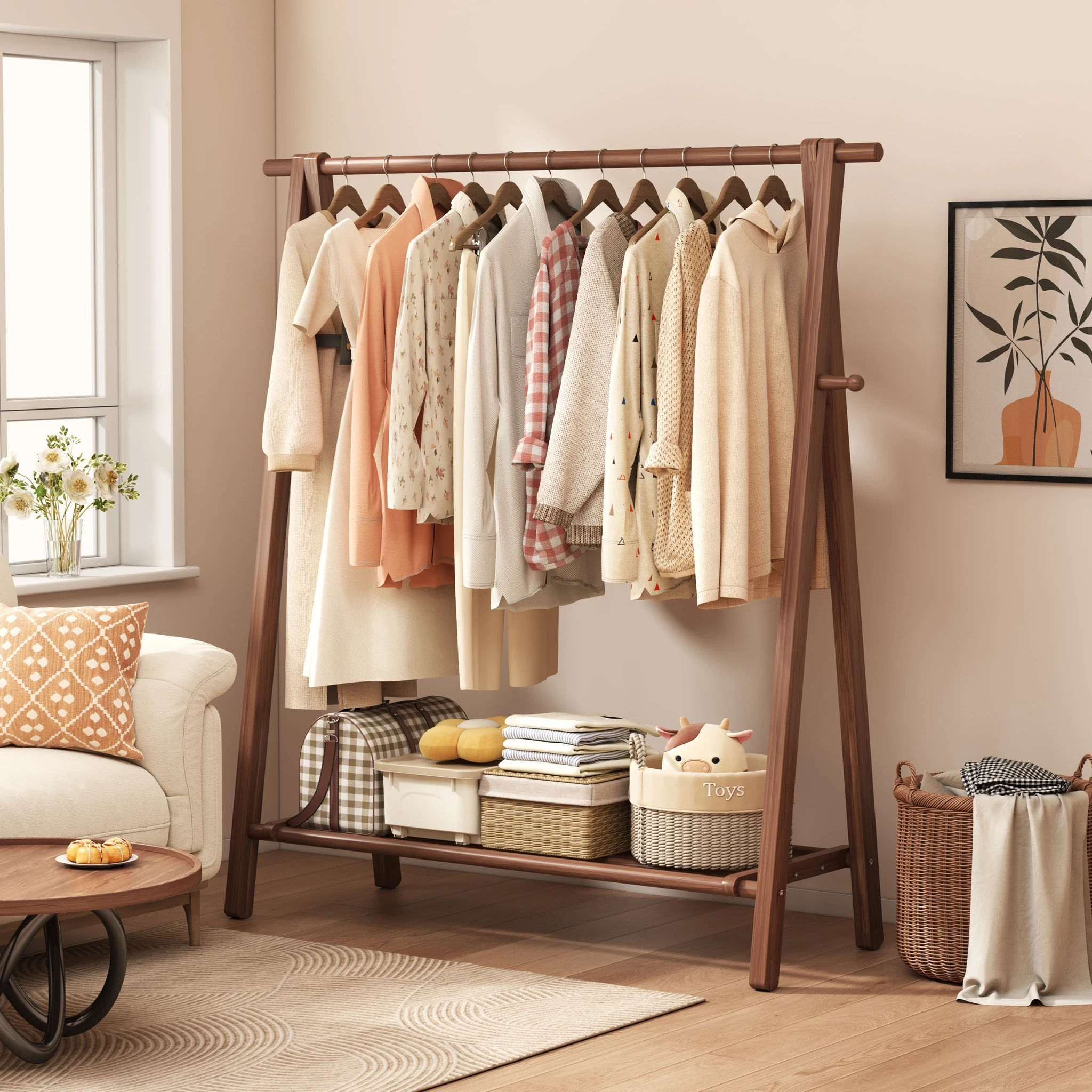 天然木材を使用したスタイリッシュなフロアコートラック - 寝室や玄関に最適なシンプルな衣類収納ラック。おしゃれで機能的なデザインで、お部屋をスッキリ整頓!