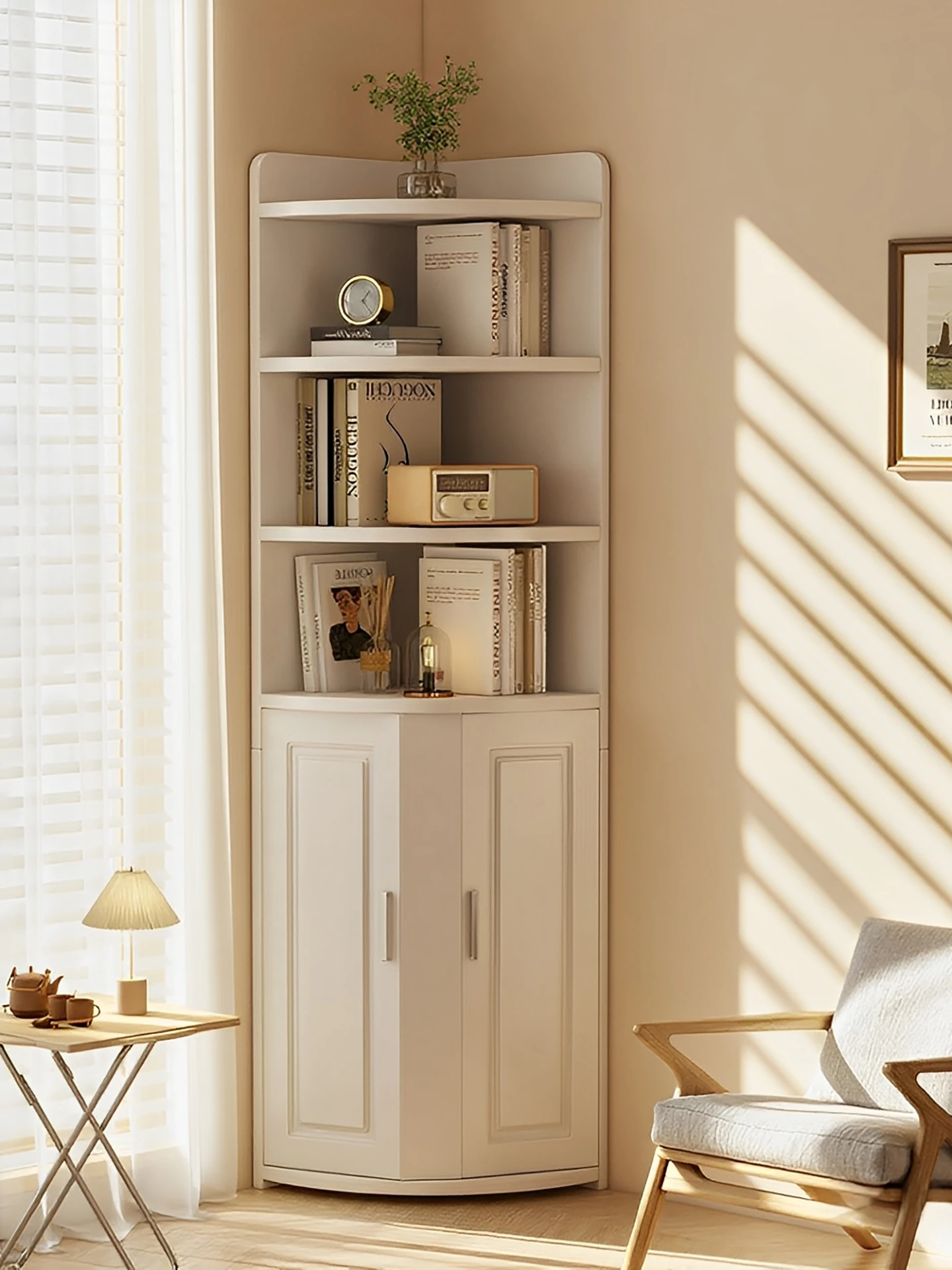北欧風の丸みを帯びた角棚 - おしゃれなリビングにぴったり!壁際に置ける省スペース設計で、収納力抜群のコーナーキャビネット。書籍や小物を美しく整理整頓し、居心地の良い空間を演出します。