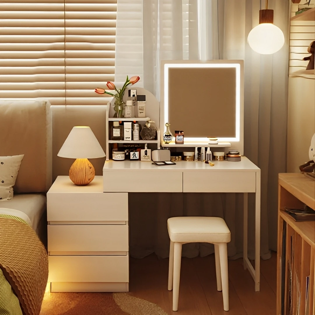 クリーム風ドレッサー、現代的でシンプルなデザインの2025年新作。高級感あふれるコンパクトな引き出し一体型、伸縮可能でお部屋をスマートに演出します!