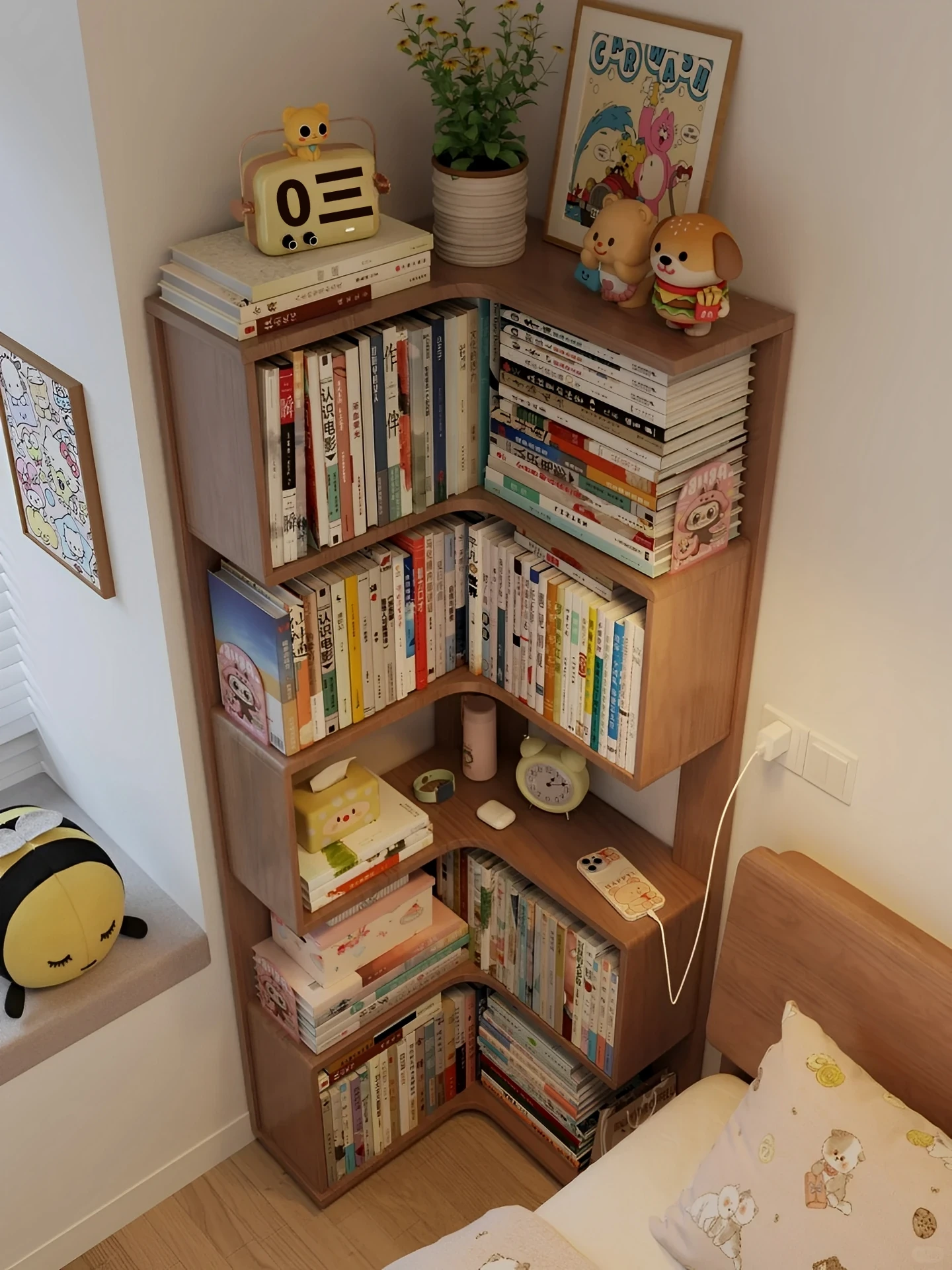 コーナー書棚・壁隅キャビネット・角棚・フロア収納キャビネット・ベッドサイドキャビネット・収納キャビネット・書棚一体型・壁に寄せられる三角棚で、スペースを有効活用し、スタイリッシュに整理整頓!